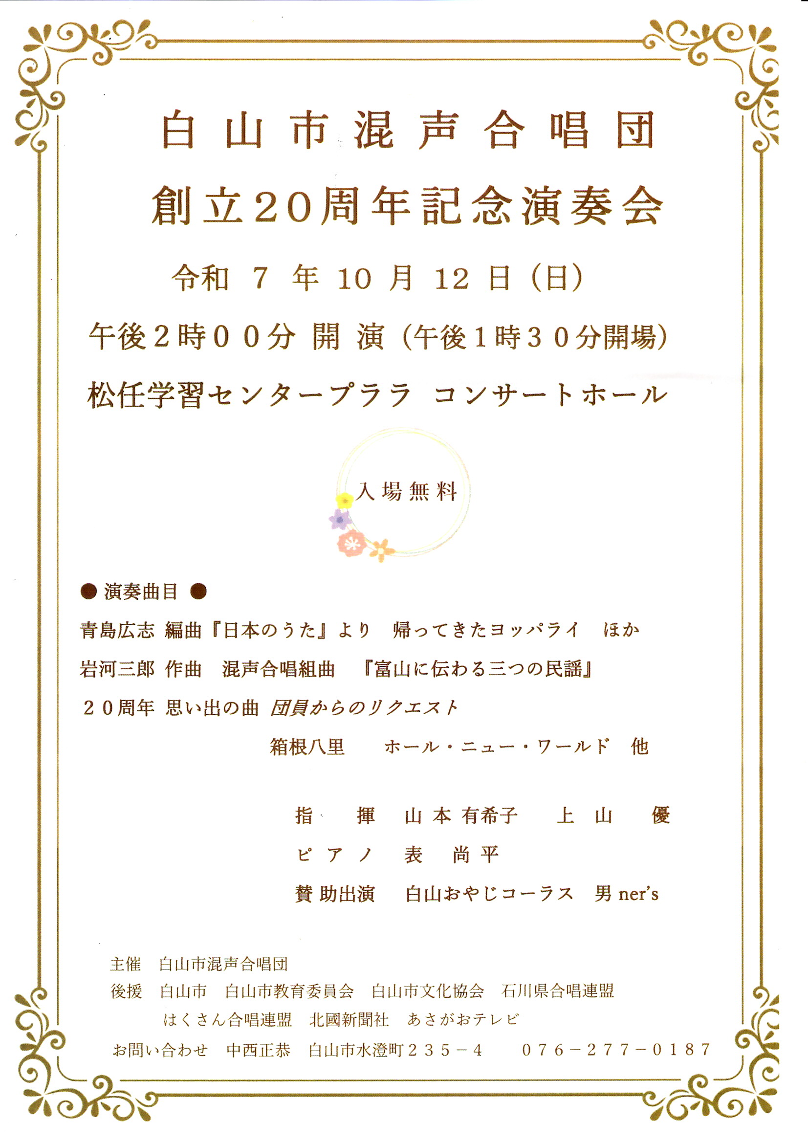 白山市混声合唱団創立20周年記念演奏会 日時 令和7年10月12日(日)開演/14:00 開場/13:30 場所 白山市松任学習センタープララコンサートホール 入場料 無料 お問合せ 中西正恭 076-277-0187