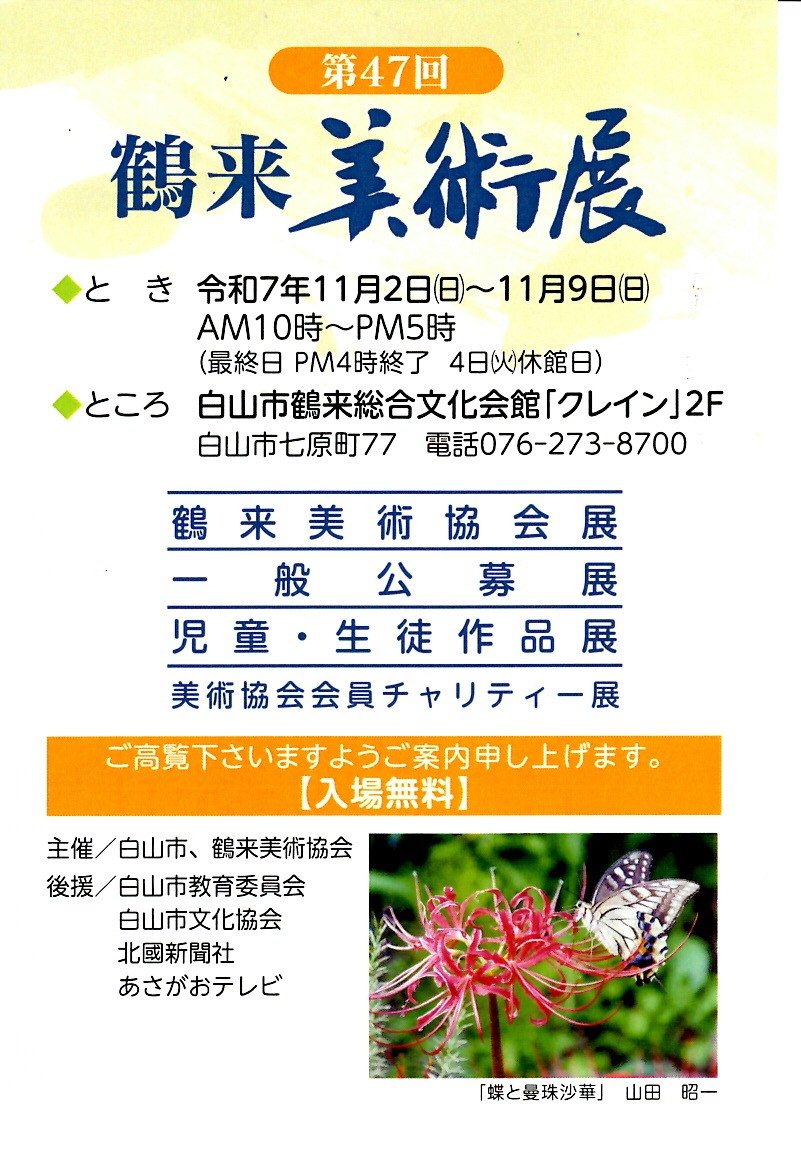 第47回鶴来美術展 日時 令和7年11月2日(日)~11月9日(日) 午前10時~午後5時(最終日午後4時 4日(火)休館日) 場所 白山市鶴来総合文化会館クレイン 2F 入場料 無料 お問合せ 白山市文化協会 076-273-4280