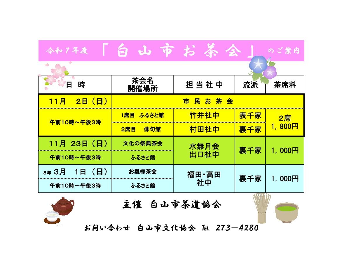 市民お茶会 ふるさと館・千代女の里俳句館での2席のお茶会 日時 令和7年11月2日(日)午前10時~午後3時 場所 1席目 ふるさと館 2席目 千代女の里俳句館 席主 白山市茶道協会 1席目 ふるさと館 竹井社中(表千家) 2席目 千代女の里俳句館 村田社中(裏千家) 茶席料 2席:1,800円 お問合せ 白山市文化協会 076-273-4280
