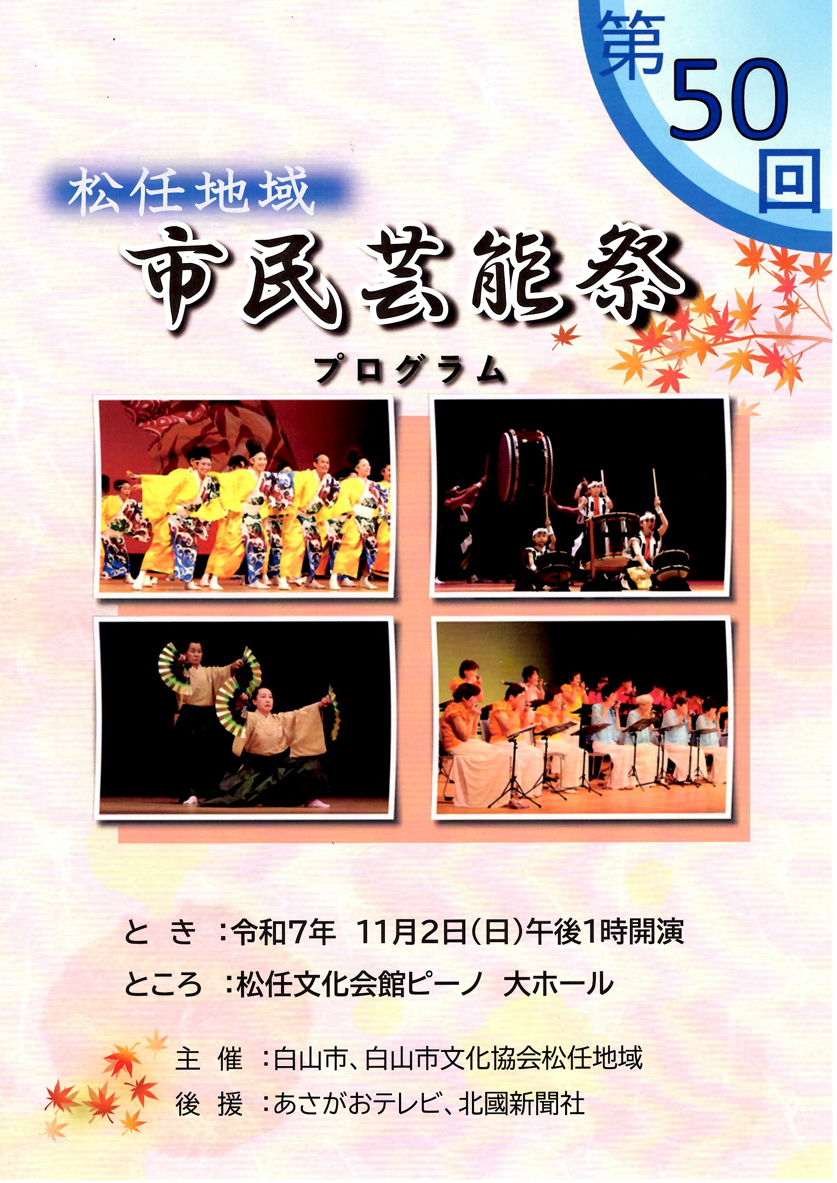 第50回 市民芸能祭(松任地域) 加盟団体による芸能発表会 日時 令和7年11月2日(日)午後1時開演 場所 松任文化会館ピーノ 大ホール 入場料 無料 お問合せ 白山市文化協会 076-273-4280 第50回松任地域市民芸能祭プログラム