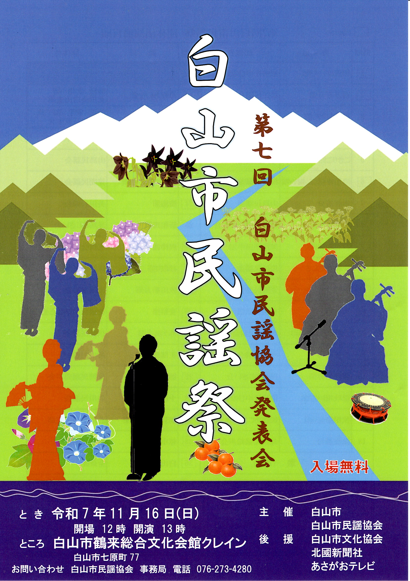 第七回白山市民謡協会発表会 白山市民謡祭 白山市民謡協会加盟団体による民謡発表会 日時 令和7年11月16日(日)開演13時(開場12時) 場所 白山市鶴来総合文化会館クレイン 入場料 無料 お問合せ 白山市民謡協会 事務局 076-273-4280 民謡祭プログラム