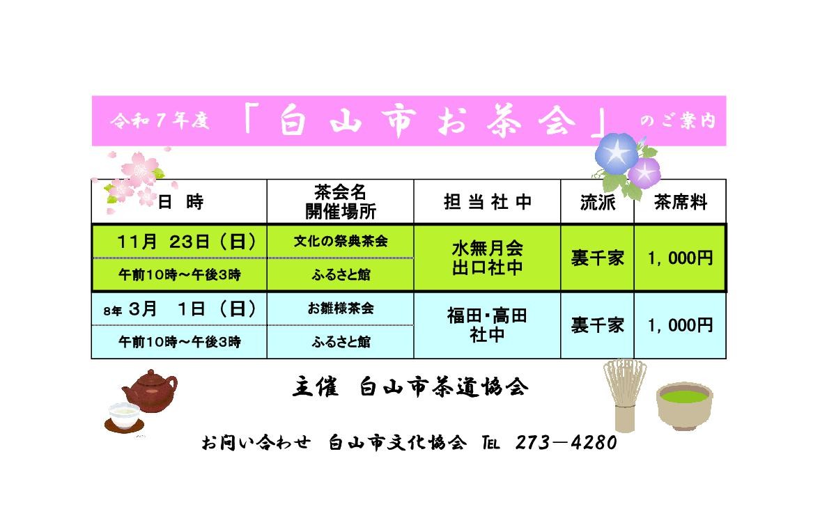 文化の祭典茶会 「がんばれ!白山文化祭2025」に合わせての、お茶会開催です 日時 令和7年11月23日(日)午前10時~午後3時 場所 ふるさと館 白山市殿町312 席主 白山市茶道協会 水無月会 出口社中(裏千家) 茶席料 1、000円 お問合せ 白山市文化協会 076-273-4280