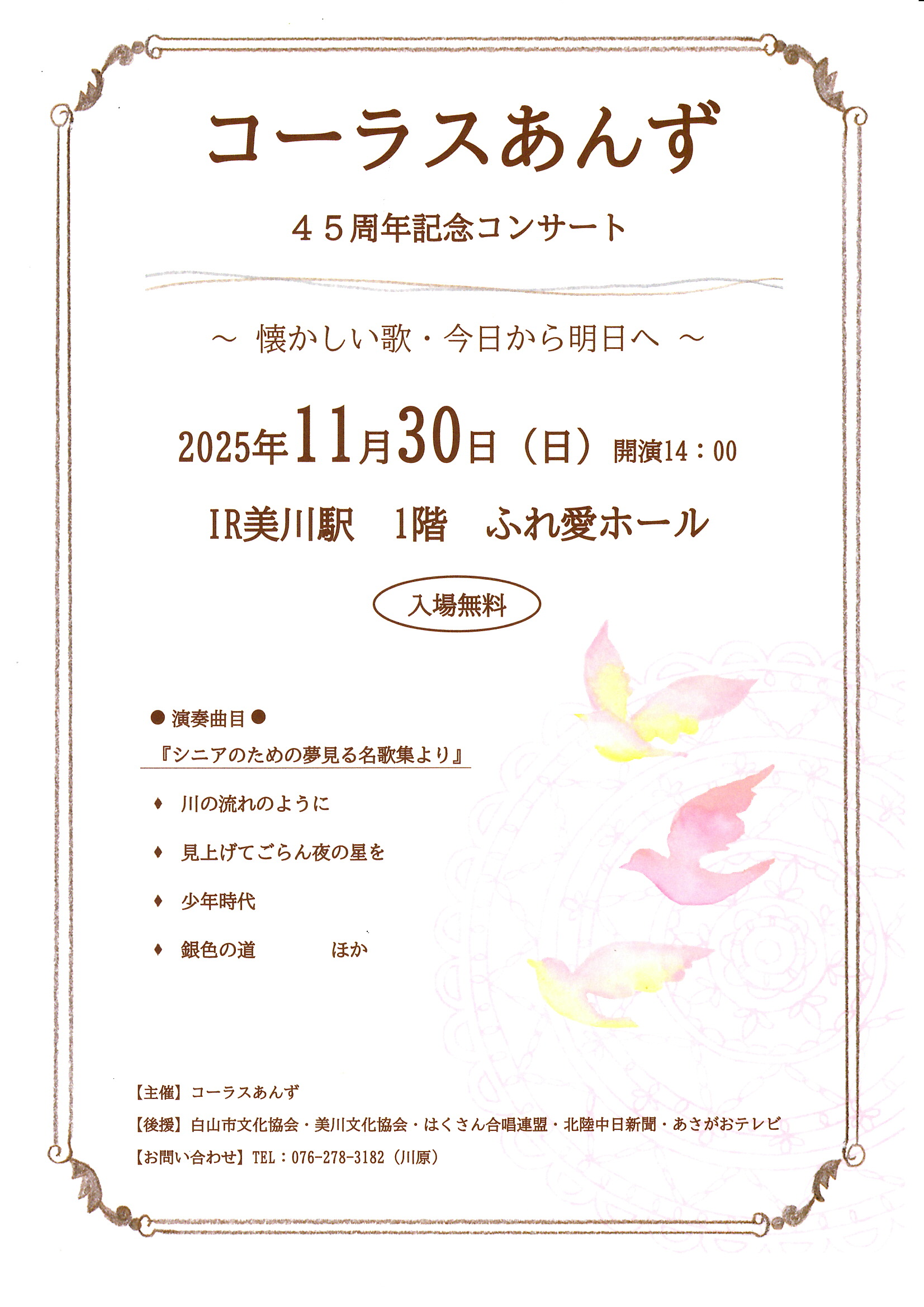 コーラスあんず 45周年記念コンサート ~懐かしい歌・今日から明日へ~ 日時 令和7年11月30日(日)開演14:00 場所 IR美川駅 1階 ふれ愛ホール 入場料 無料 お問合せ 川原 076-278-3182