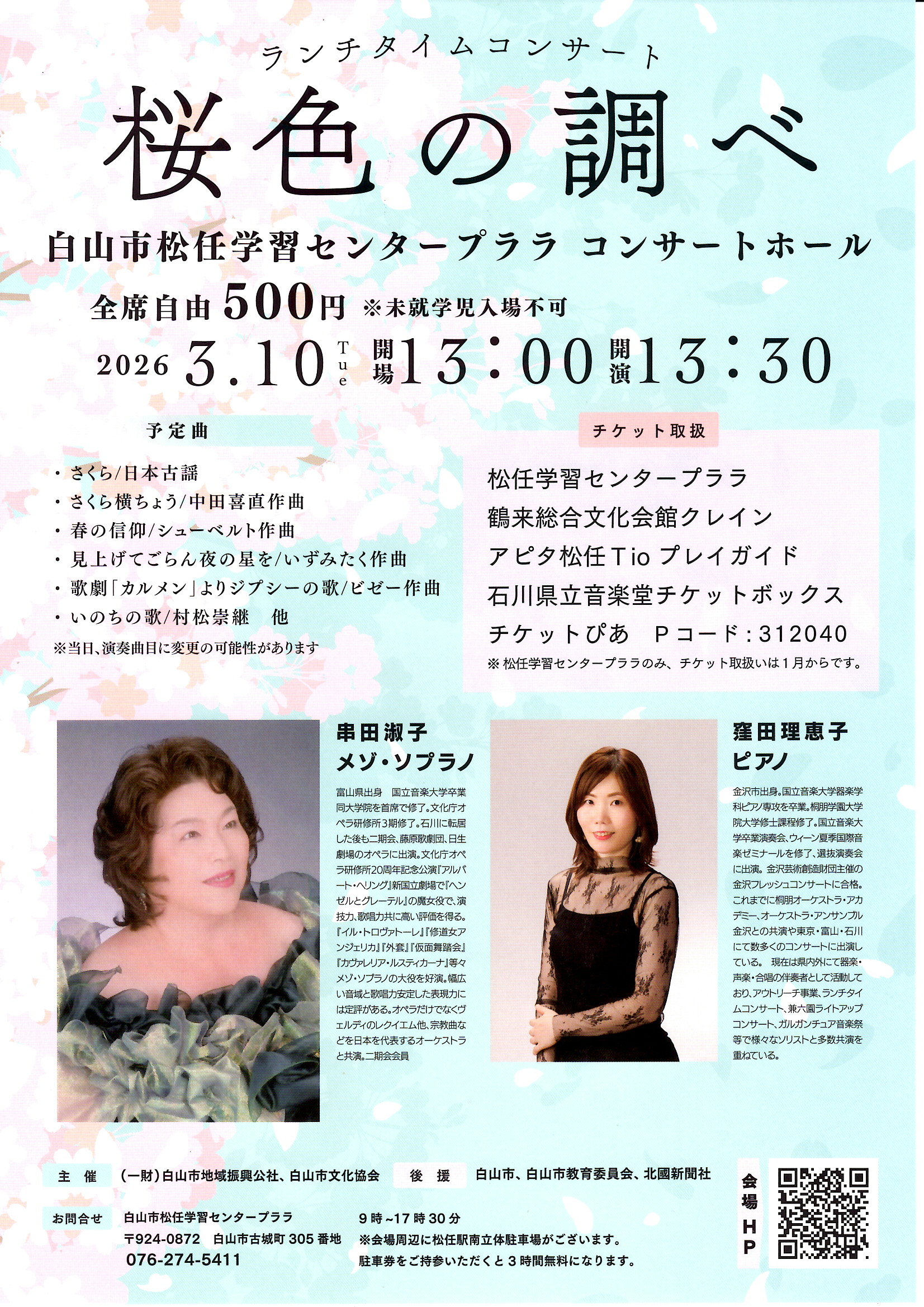ランチタイムコンサート 桜色の調べ 日時 2026年3月10日(火) 開場/13:00 開演/13:30 会場 白山市松任学習センタープララコンサートホール 入場料 500円(全席自由)※未就学児入場不可 お問合せ 白山市松任学習センター 076-274-5411