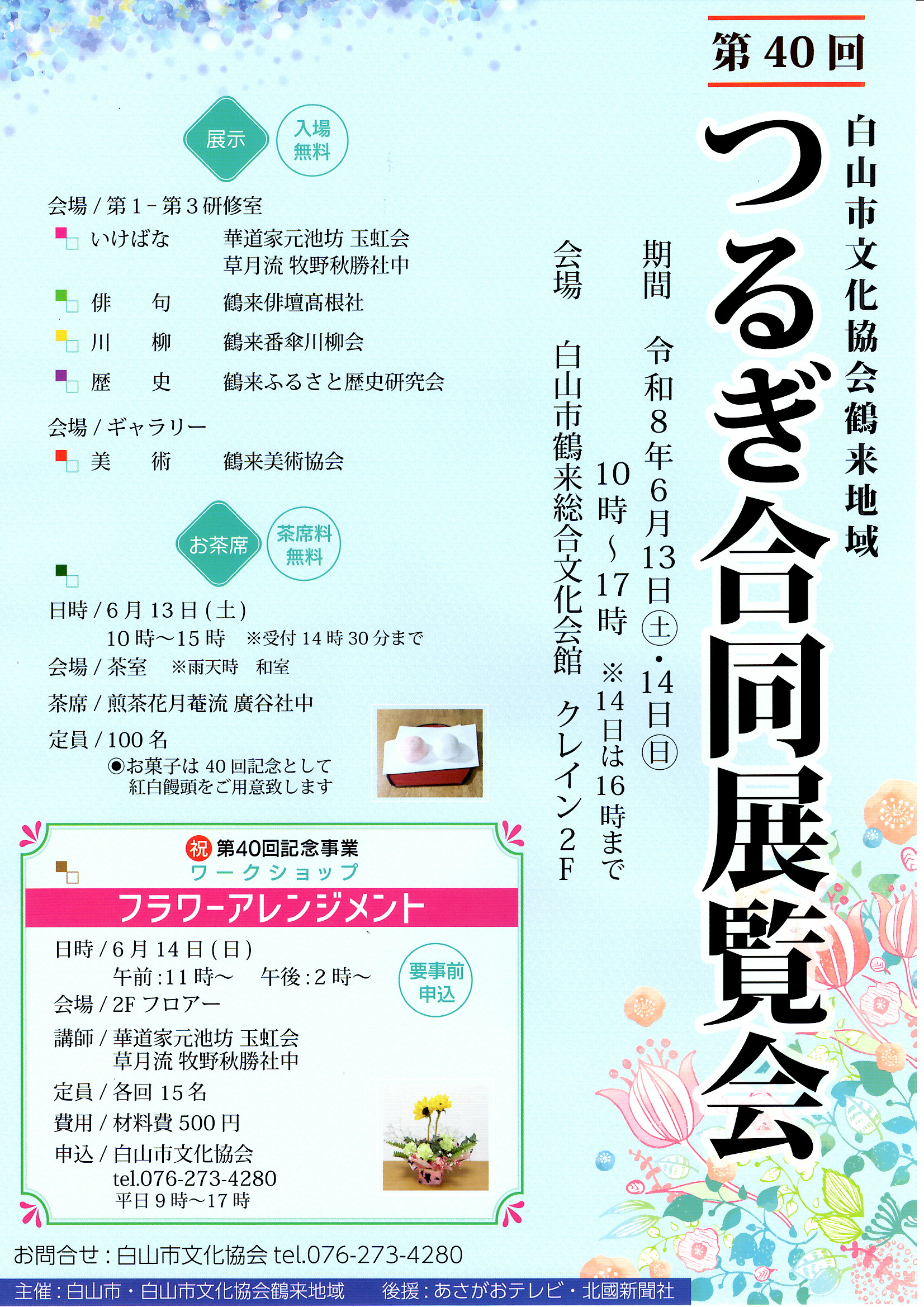 白山市文化協会鶴来地域 第40回つるぎ合同展覧会 日時 令和8年6月13日(土)・14日(日)10時~17時 (14日16時) ※お茶席6月13日(土)10時~15時(受付) ※フラワーアレンジメント6月14日(日) 午前11時~、午後2時~(定員:各回15名)要事前申込 会場 白山市鶴来総合文化会館クレイン 2F 展 示:第1~3研修室・ギャラリー 煎茶席:茶室(雨天の場合:和室) フラワーアレンジメント:2階フロアー 費用 展示:無料 お茶席:無料 フラワーアレンジメント:材料費500円 お問合せ 白山市文化協会 076-273-4280